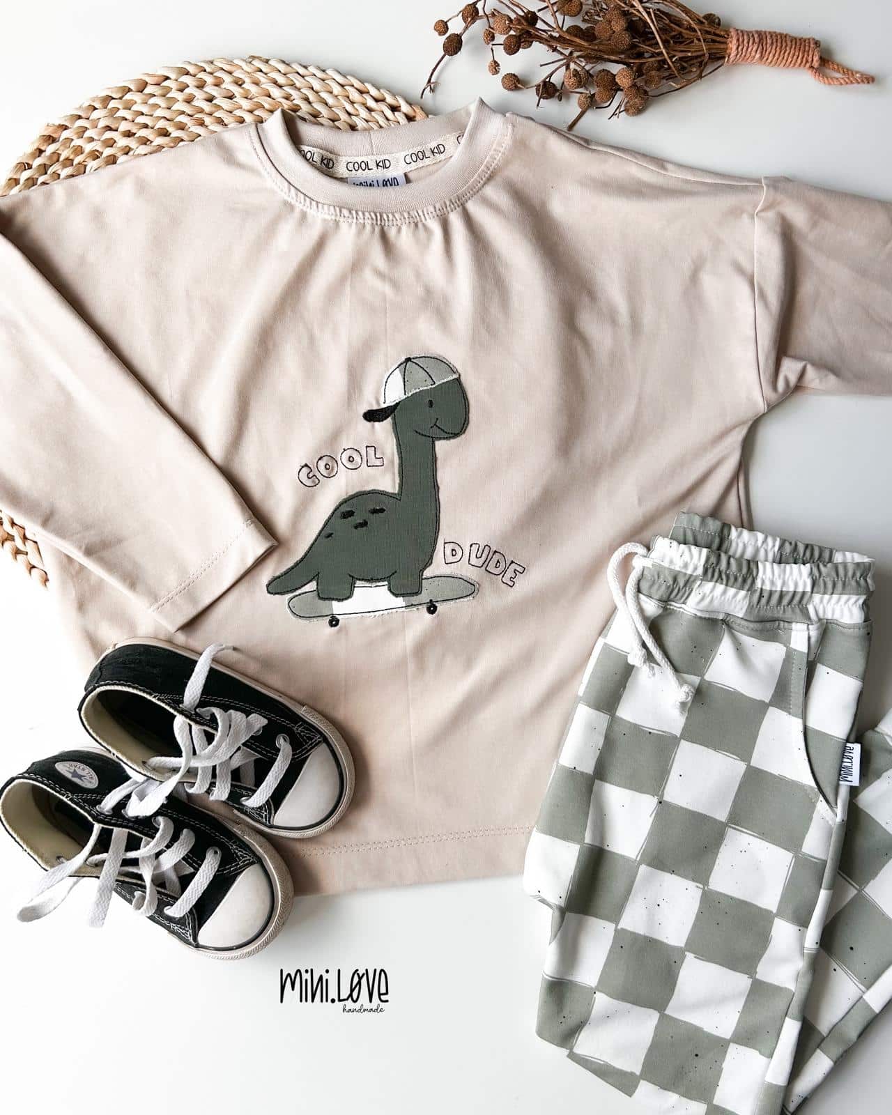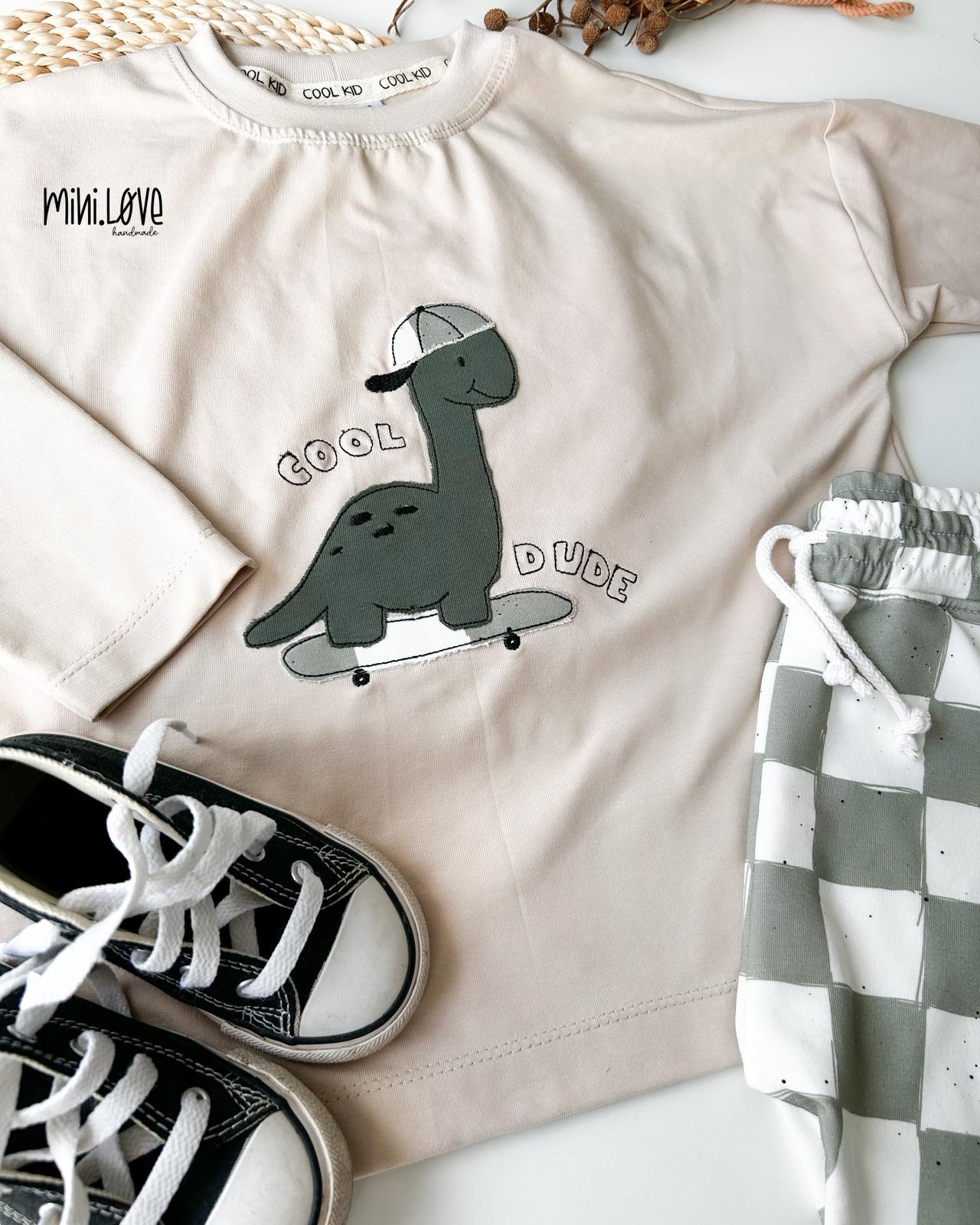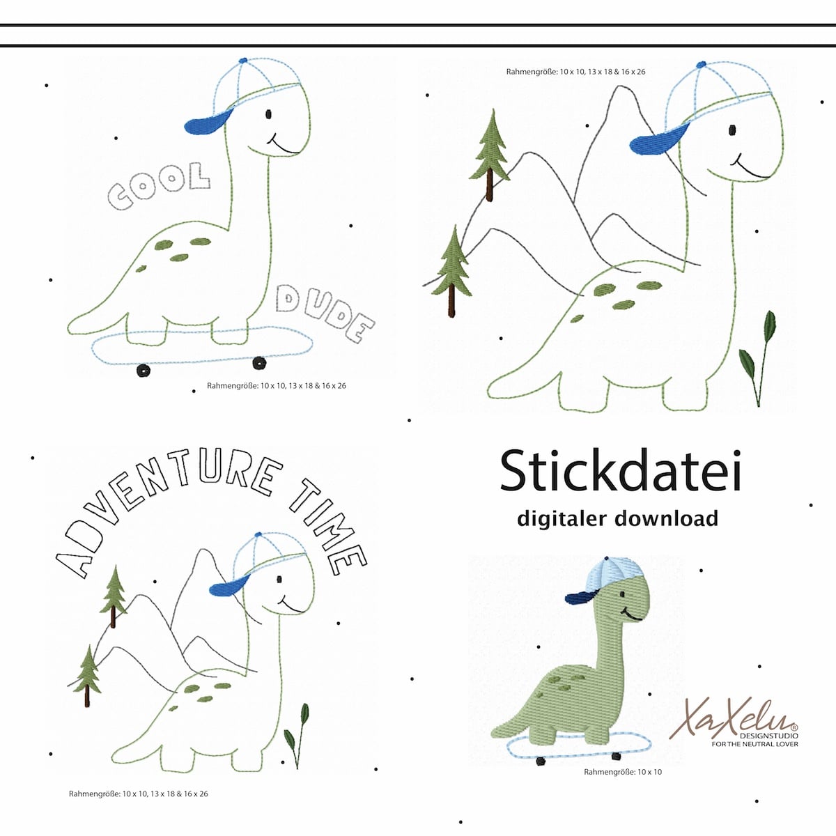 Die Stickdatei „Cool Dino“ gibt es in drei Varianten (inklusive einer Mini-Vollstickdatei als Bonus) – perfekt für Kleidung, Taschen, Kinderaccessoires oder kleine Geschenkideen.