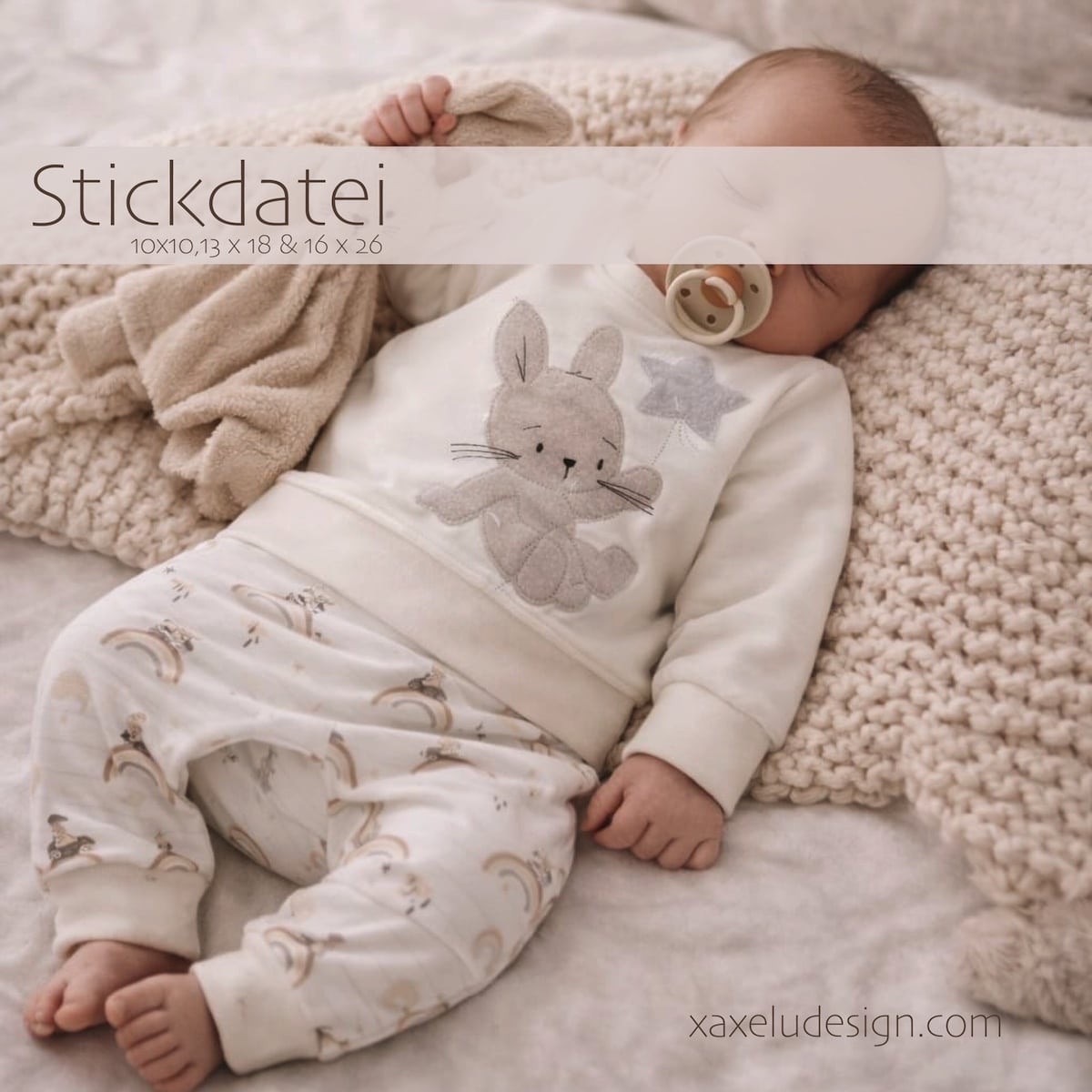 Die Stickdatei „Hasi Hope“ bringt direkt gute Laune & ihr könnt hier direkt wählen ob ihr denn kleinen Hasen bis zu den Sternen oder in die Wolken fliegen lasst.Perfekt für Kinderkleidung, Accessoires, Deko oder Geschenkideen, Kissen, Kuscheldecken…dieses Stickmotiv verleiht jedem Projekt einen ganz besonderen, herzigen Look und es wird alle verzaubern.